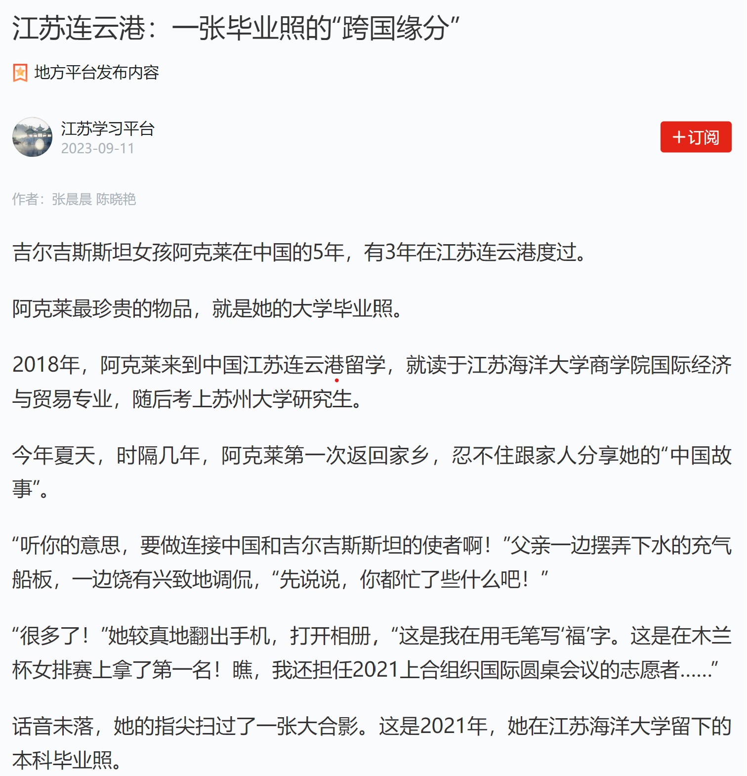吉尔吉斯斯坦女孩阿克莱在中国的5年,有3年在江苏连云港度过。