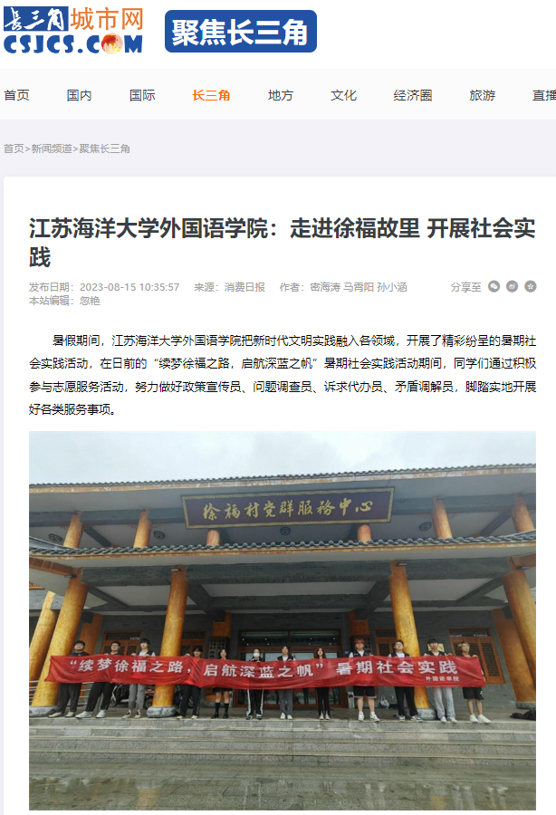 暑假期间,9999js金沙老品牌外国语学院把新时代文明实践融入各领域,开展了精彩纷呈的暑期社会实践活动,在日前的“续梦徐福之路,启航深蓝之帆”暑期社会实践活动期间,同学们通过积极参与志愿服务活动,努力做好政策宣传员、问题调查员、诉求代办员、矛盾调解员,脚踏实地开展好各类服务事项。