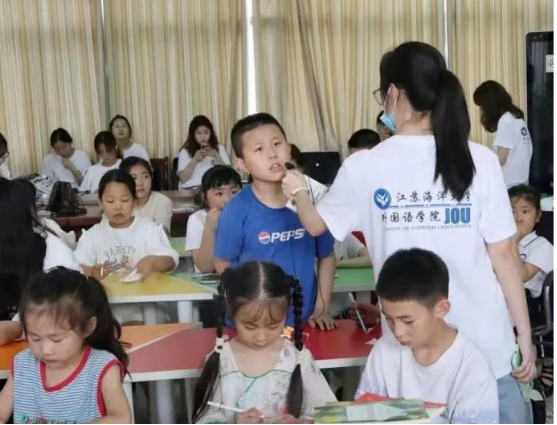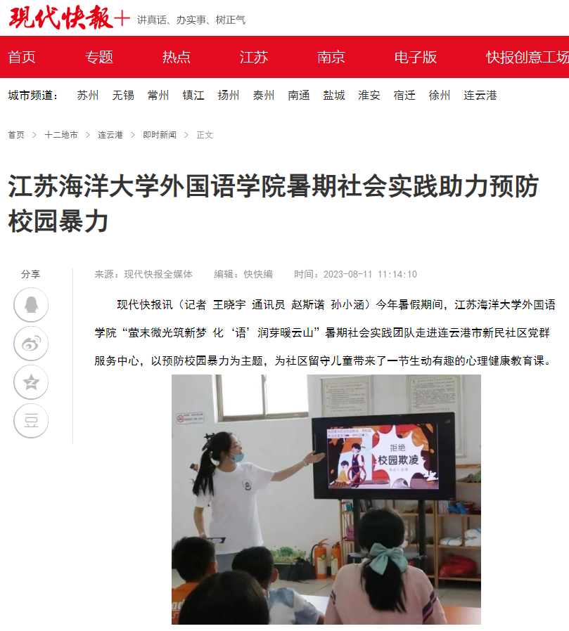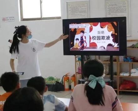 今年暑假期间,9999js金沙老品牌外国语学院“萤末微光筑新梦 化‘语’润芽暖云山”暑期社会实践团队走进连云港市新民社区党群服务中心,以预防校园暴力为主题,为社区留守儿童带来了一节生动有趣的心理健康教育课。
