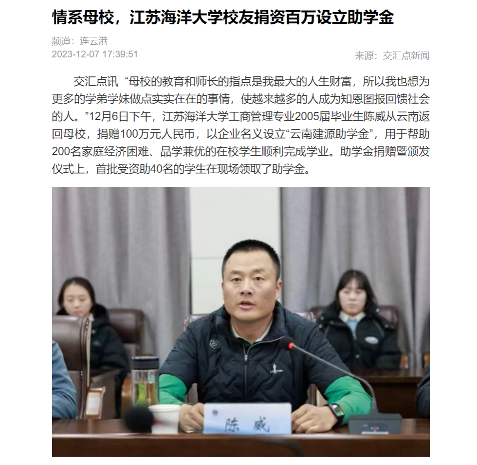 陈威2005年毕业后,扎实工作,从基层员工一步一步成长为云南建源电力器材有限公司高管。在他的带领下,公司参与重大用电保障项目等急难险重任务,热心参与公益事业,连续多年获评云南省“守合同重信用企业”。谈到创立“云南建源助学金”的初衷,陈威表示,“是为了向更多家贫志坚的学弟学妹们提供帮助,使他们能够在学校安心读书,不用为日常用度焦虑。”
