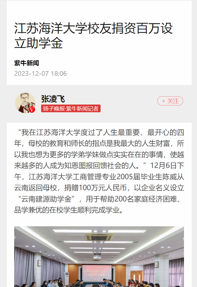陈威2005年毕业后,扎实工作,从基层员工一步一步成长为云南建源电力器材有限公司高管。在他的带领下,公司参与重大用电保障项目、抗冰救灾等急难险重任务,热心参与公益事业,连续多年获评云南省“守合同重信用企业”。谈到创立“云南建源助学金”的初衷,陈威表示,“是为了向更多家贫志坚的学弟学妹们提供帮助,使他们能够在学校安心读书,不用为日常用度焦虑,健康快乐充实地度过可能是一生中最美好的大学时光,努力成为知恩图报回馈社会的人。”