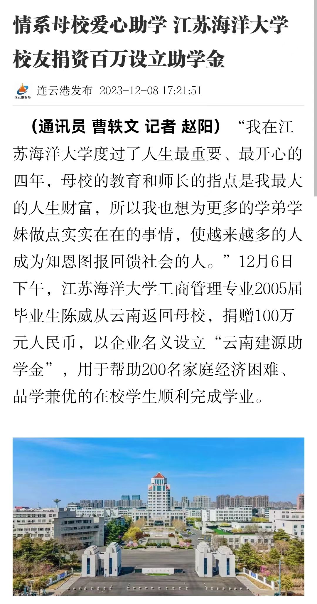 陈威2005年毕业后,扎实工作,从基层员工一步一步成长为云南建源电力器材有限公司高管。在他的带领下,公司参与重大用电保障项目、抗冰救灾等急难险重任务,热心参与公益事业,连续多年获评云南省“守合同重信用企业”。谈到创立“云南建源助学金”的初衷,陈威表示,“是为了向更多家贫志坚的学弟学妹们提供帮助,使他们能够在学校安心读书,不用为日常用度焦虑,健康快乐充实地度过可能是一生中最美好的大学时光,努力成为知恩图报回馈社会的人。”