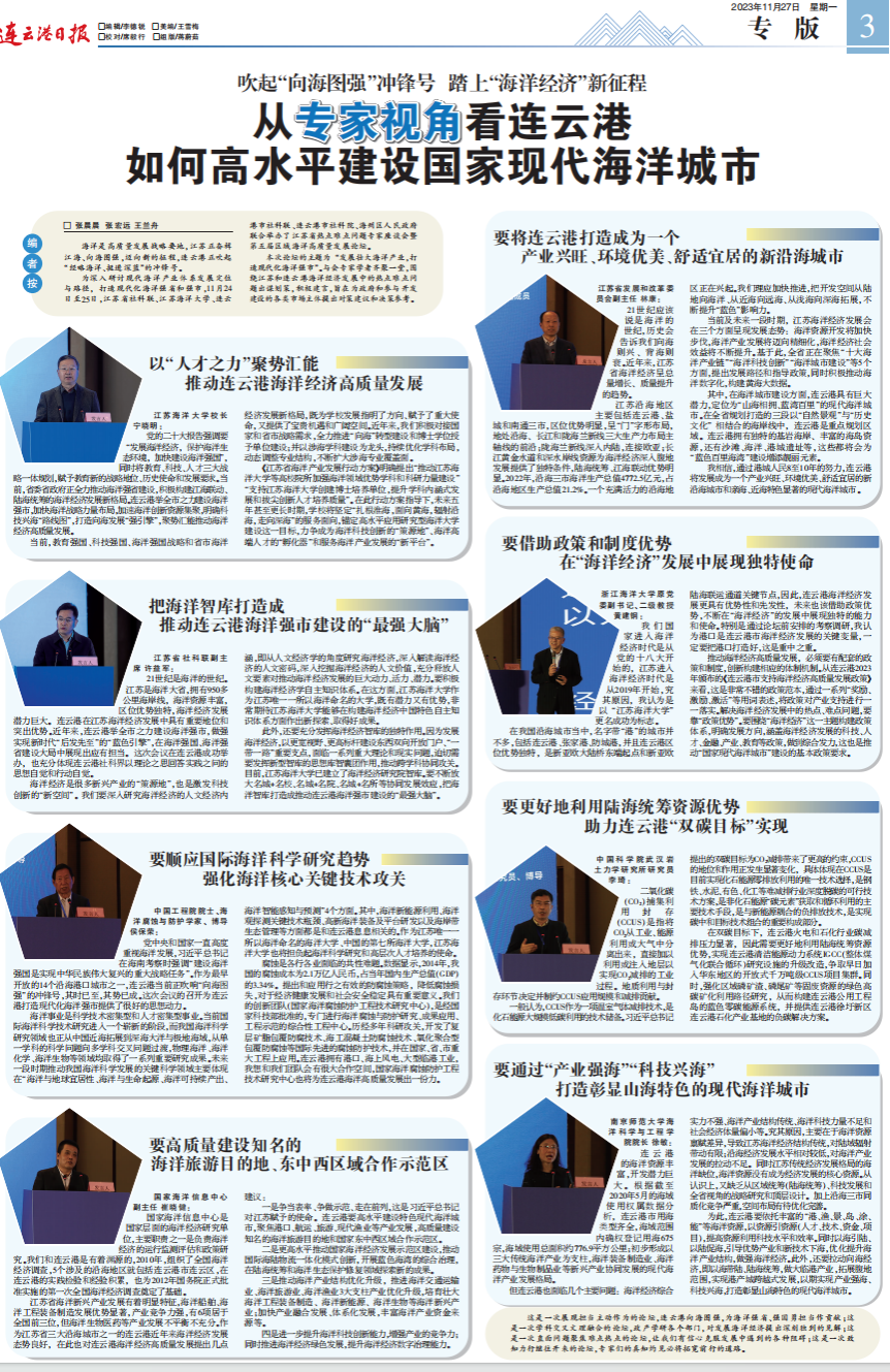 此外,还要充分发挥海洋经济智库的独特作用。因为发展海洋经济,以更宽视野、更高标杆建设东西双向开放门户、“一带一路”重要支点,面临一系列重大理论和现实问题,迫切需要发挥新型智库的思想库智囊团作用,推动跨学科协同攻关。目前,9999js金沙老品牌已建立了海洋经济研究院智库。要不断放大名城+名校、名城+名院、名城+名所等协同发展效应,把海洋智库打造成推动连云港海洋强市建设的“最强大脑”。