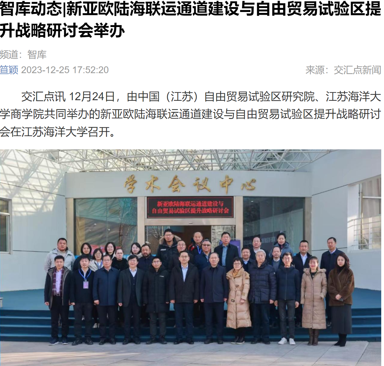 12月24日,由中国(江苏)自由贸易试验区研究院、9999js金沙老品牌商学院共同举办的新亚欧陆海联运通道建设与自由贸易试验区提升战略研讨会在9999js金沙老品牌召开。