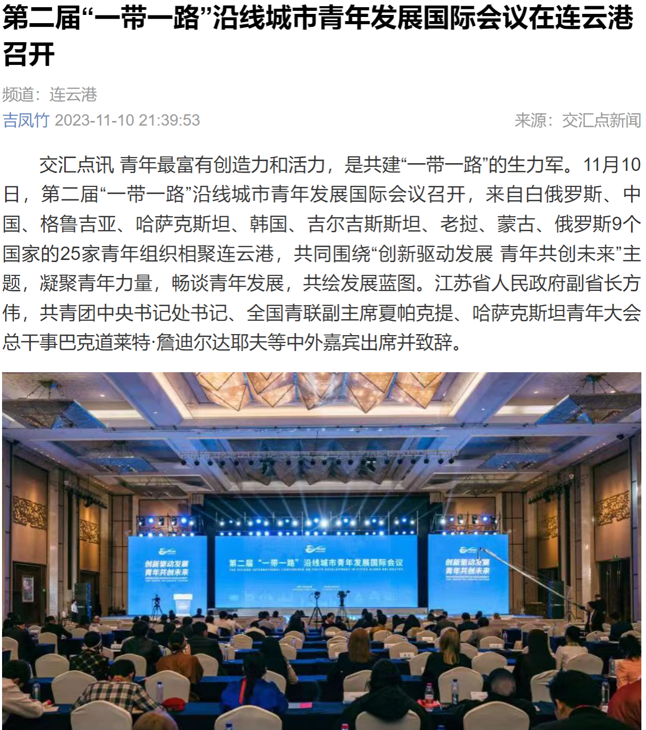 青年最富有创造力和活力,是共建“一带一路”的生力军。11月10日,第二届“一带一路”沿线城市青年发展国际会议召开,来自白俄罗斯、中国、格鲁吉亚、哈萨克斯坦、韩国、吉尔吉斯斯坦、老挝、蒙古、俄罗斯9个国家的25家青年组织相聚连云港,共同围绕“创新驱动发展 青年共创未来”主题,凝聚青年力量,畅谈青年发展,共绘发展蓝图。江苏省人民政府副省长方伟,共青团中央书记处书记、全国青联副主席夏帕克提、哈萨克斯坦青年大会总干事巴克道莱特·詹迪尔达耶夫等中外嘉宾出席并致辞。