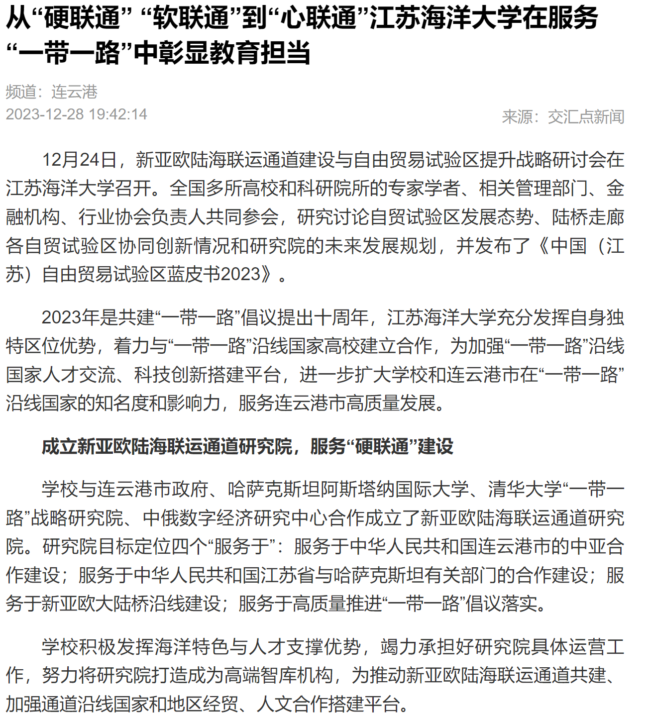 学校与连云港市政府、哈萨克斯坦阿斯塔纳国际大学、清华大学“一带一路”战略研究院、中俄数字经济研究中心合作成立了新亚欧陆海联运通道研究院。研究院目标定位四个“服务于”:服务于中华人民共和国连云港市的中亚合作建设;服务于中华人民共和国江苏省与哈萨克斯坦有关部门的合作建设;服务于新亚欧大陆桥沿线建设;服务于高质量推进“一带一路”倡议落实。