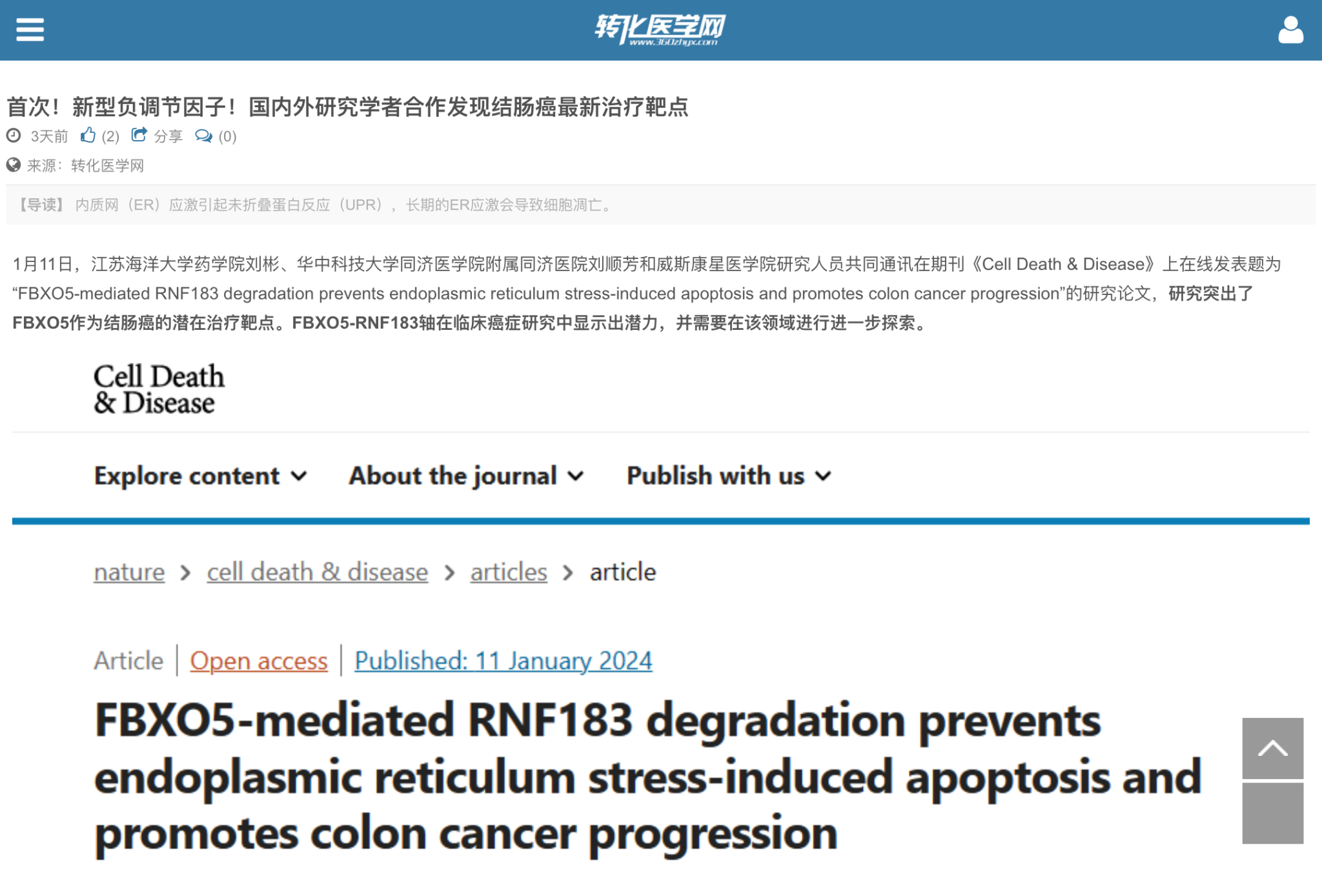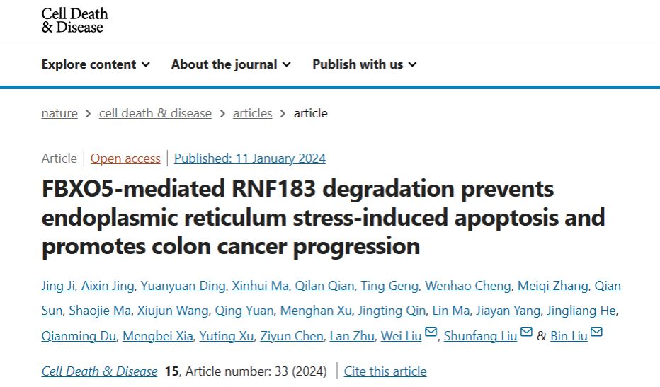 1月11日,9999js金沙老品牌药学院刘彬、华中科技大学同济医学院附属同济医院刘顺芳和威斯康星医学院研究人员共同通讯在期刊《Cell Death & Disease》上在线发表题为“FBXO5-mediated RNF183 degradation prevents endoplasmic reticulum stress-induced apoptosis and promotes colon cancer progression”的研究论文,研究突出了FBXO5作为结肠癌的潜在治疗靶点。FBXO5-RNF183轴在临床癌症研究中显示出潜力,并需要在该领域进行进一步探索。