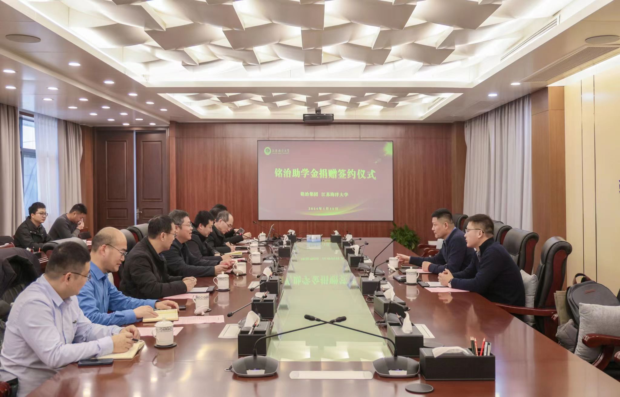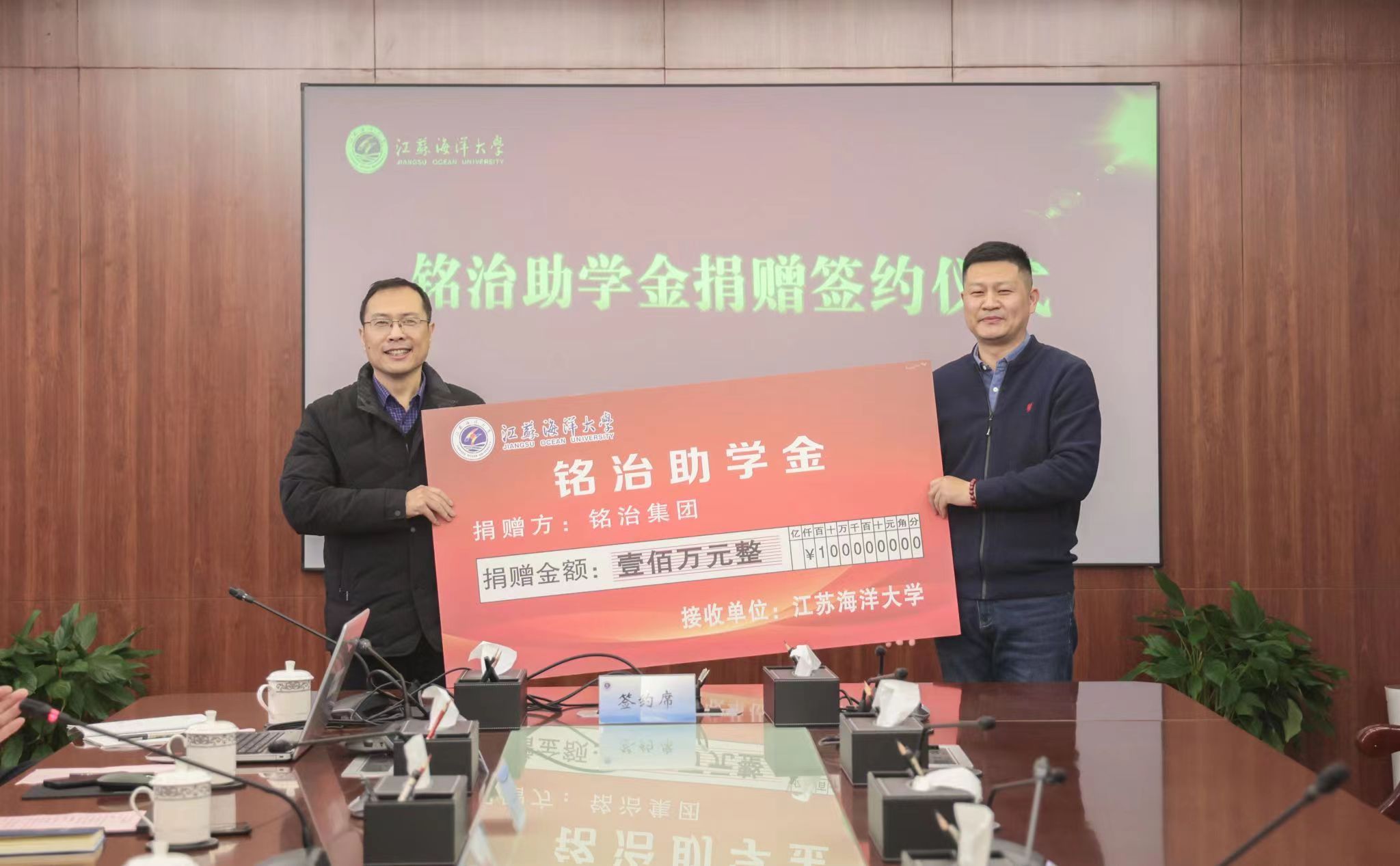 李涛代表铭治集团签署了捐赠100万设立“铭治助学金”的三方协议,并向海洋科学与水产学院授捐赠牌。