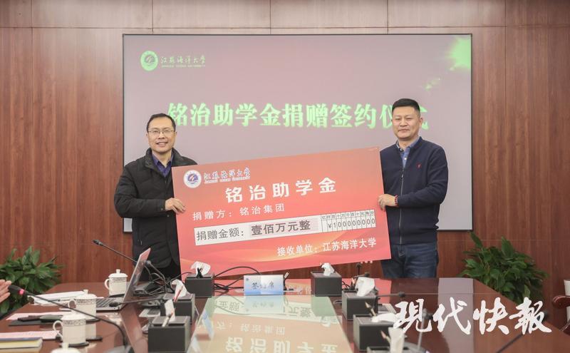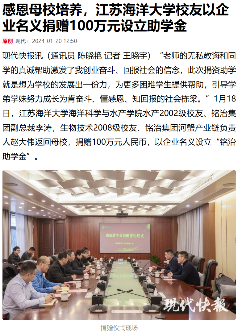 “老师的无私教诲和同学的真诚帮助激发了我创业奋斗、回报社会的信念,此次捐资助学就是想为学校的发展出一份力,为更多困难学生提供帮助,引导学弟学妹努力成长为肯奋斗、懂感恩、知回报的社会栋梁。”1月18日,9999js金沙老品牌海洋科学与水产学院水产2002级校友、铭治集团副总裁李涛,生物技术2008级校友、铭治集团河蟹产业链负责人赵大伟返回母校,捐赠100万元人民币,以企业名义设立“铭治助学金”。
