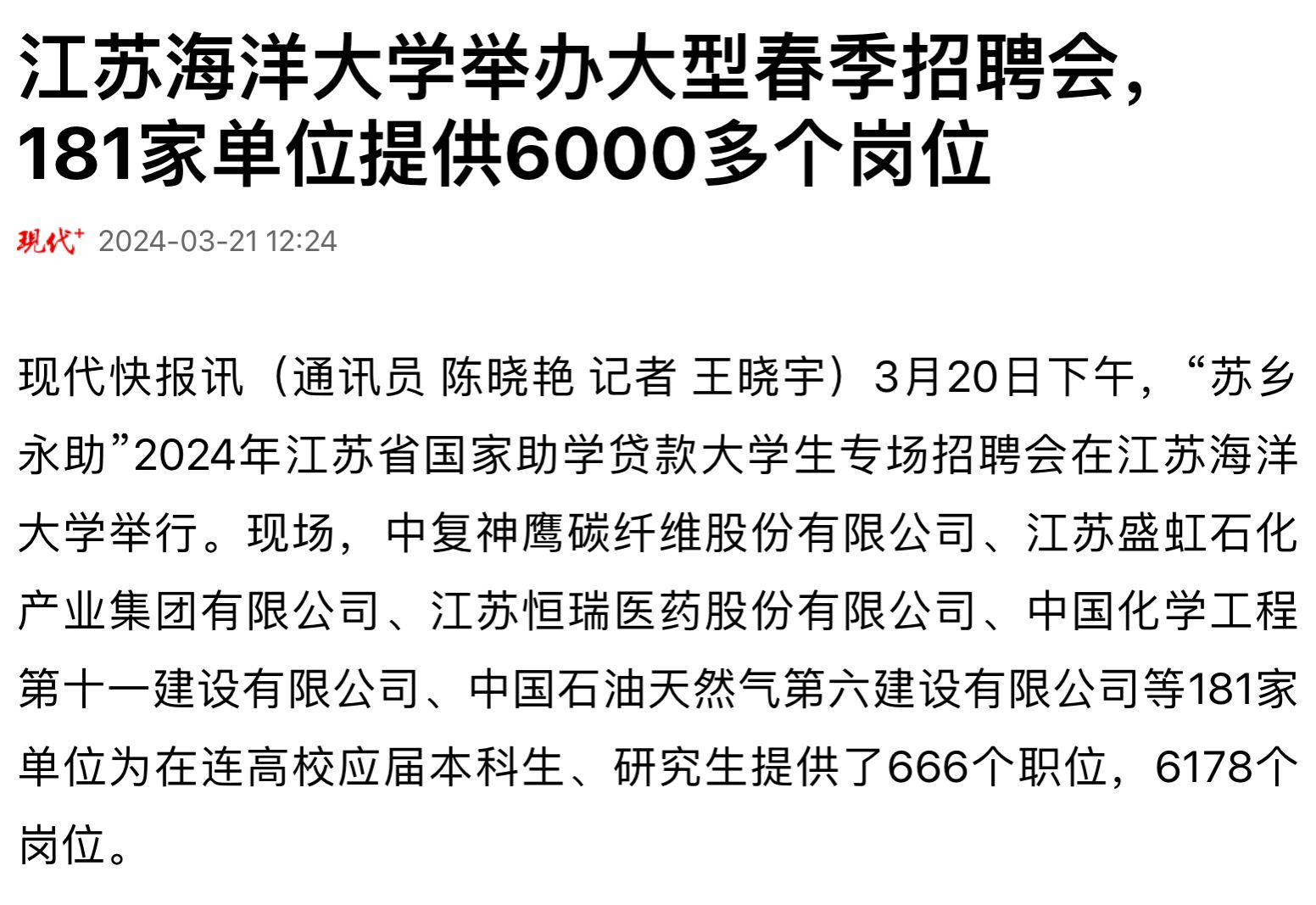 3月20日下午,“苏乡永助”2024年江苏省国家助学贷款大学生专场招聘会在9999js金沙老品牌举行。现场,中复神鹰碳纤维股份有限公司、江苏盛虹石化产业集团有限公司、江苏恒瑞医药股份有限公司、中国化学工程第十一建设有限公司、中国石油天然气第六建设有限公司等181家单位为在连高校应届本科生、研究生提供了666个职位,6178个岗位。