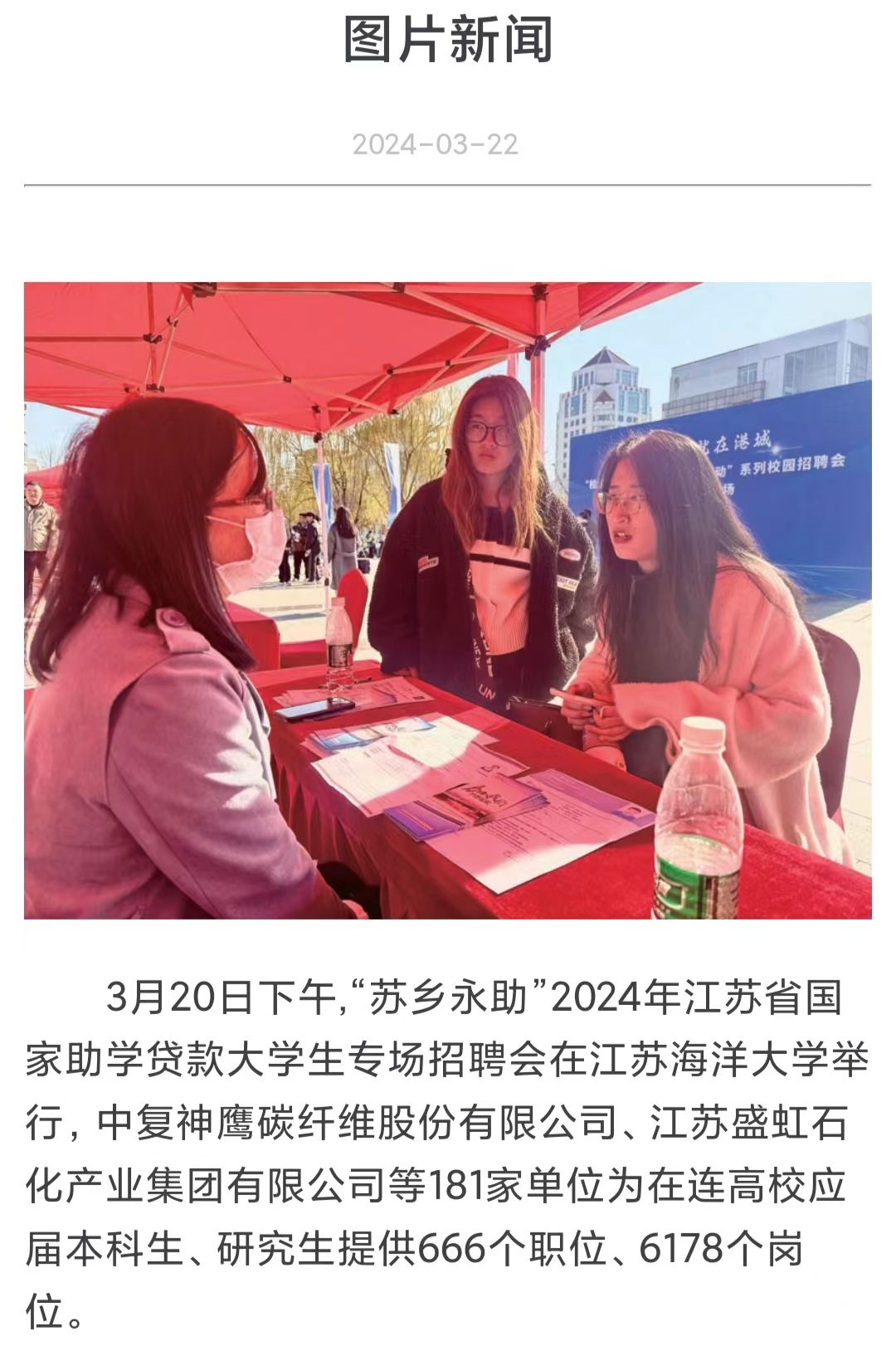 3月20日下午,“苏乡永助”2024年江苏省国家助学贷款大学生专场招聘会在9999js金沙老品牌举行,中复神鹰碳纤维股份有限公司、江苏盛虹石化产业集团有限公司等181家单位为在连高校应届本科生、研究生提供666个职位、6178个岗位。