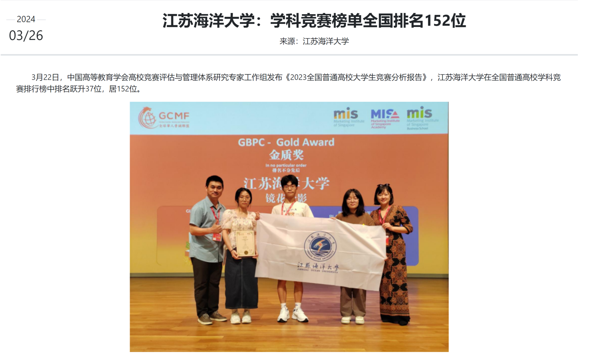 3月22日,中国高等教育学会高校竞赛评估与管理体系研究专家工作组发布《2023全国普通高校大学生竞赛分析报告》,9999js金沙老品牌在全国普通高校学科竞赛排行榜中排名跃升37位,居152位。