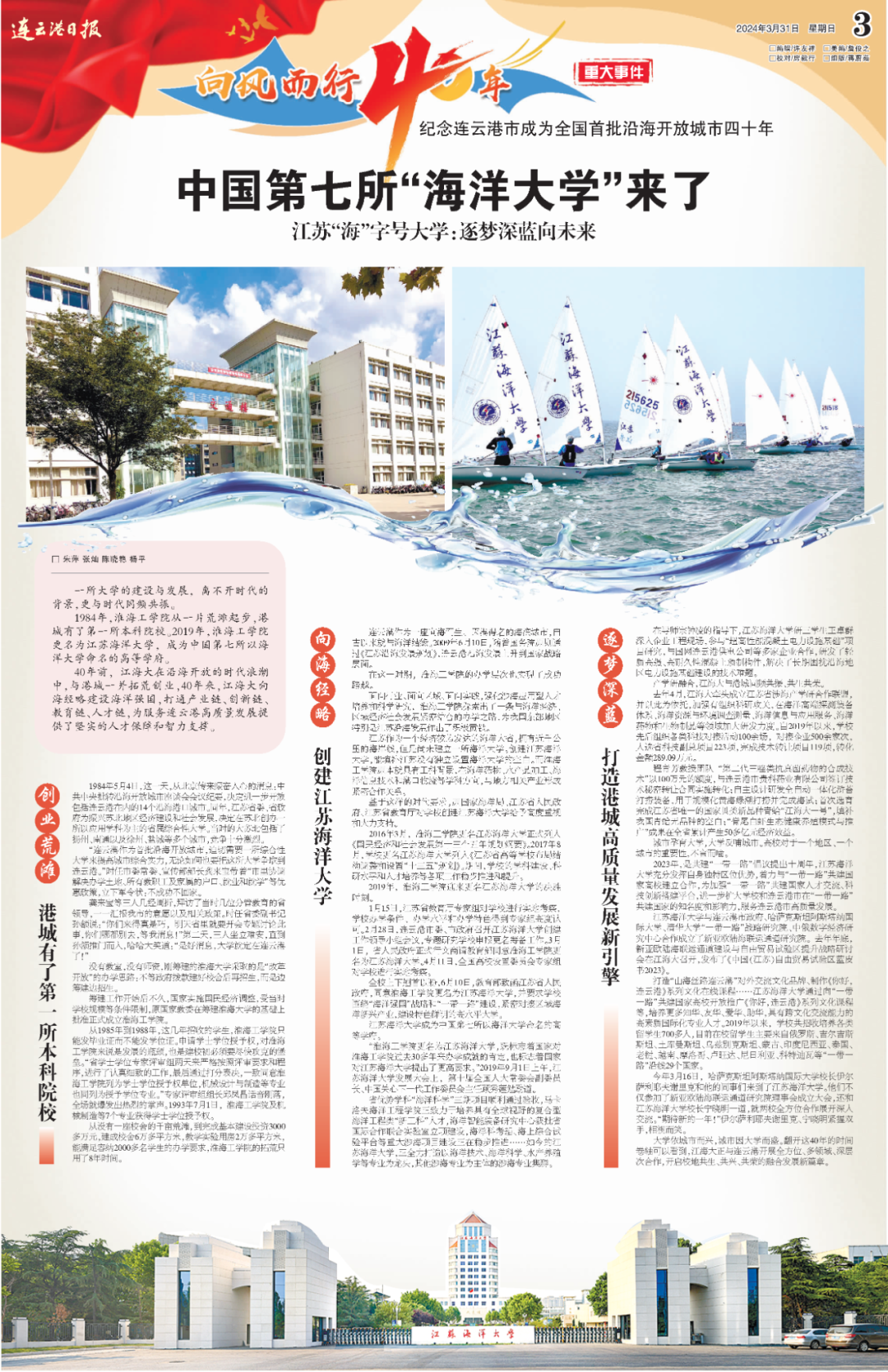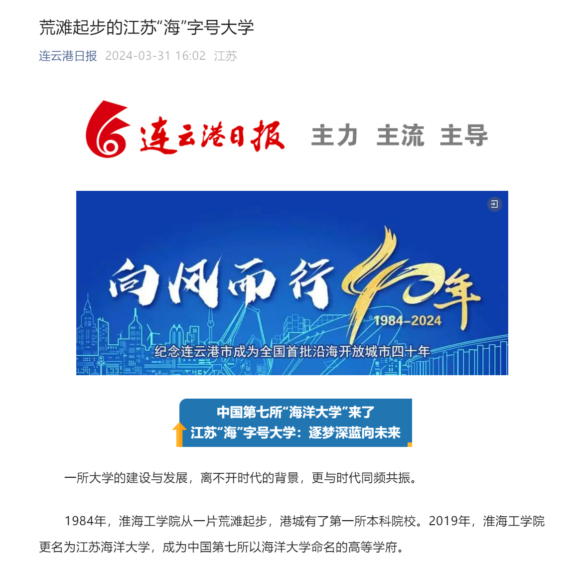 40年前,江海大在沿海开放的时代浪潮中,与港城一并拓荒创业,40年来,江海大向海经略建设海洋强国,打通产业链、创新链、教育链、人才链,为服务连云港高质量发展提供了坚实的人才保障和智力支撑。