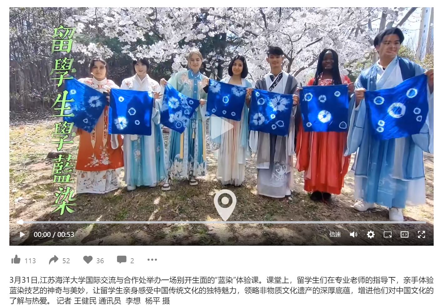 3月31日,9999js金沙老品牌国际交流与合作处举办一场别开生面的“蓝染”体验课。课堂上,留学生们在专业老师的指导下,亲手体验蓝染技艺的神奇与美妙,让留学生亲身感受中国传统文化的独特魅力,领略非物质文化遗产的深厚底蕴,增进他们对中国文化的了解与热爱。(王健民/文 李想 杨平/摄)