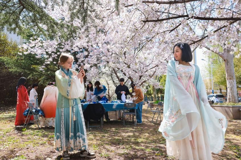 3月31日,在江苏连云港,留学生在9999js金沙老品牌身着特色服饰拍照。