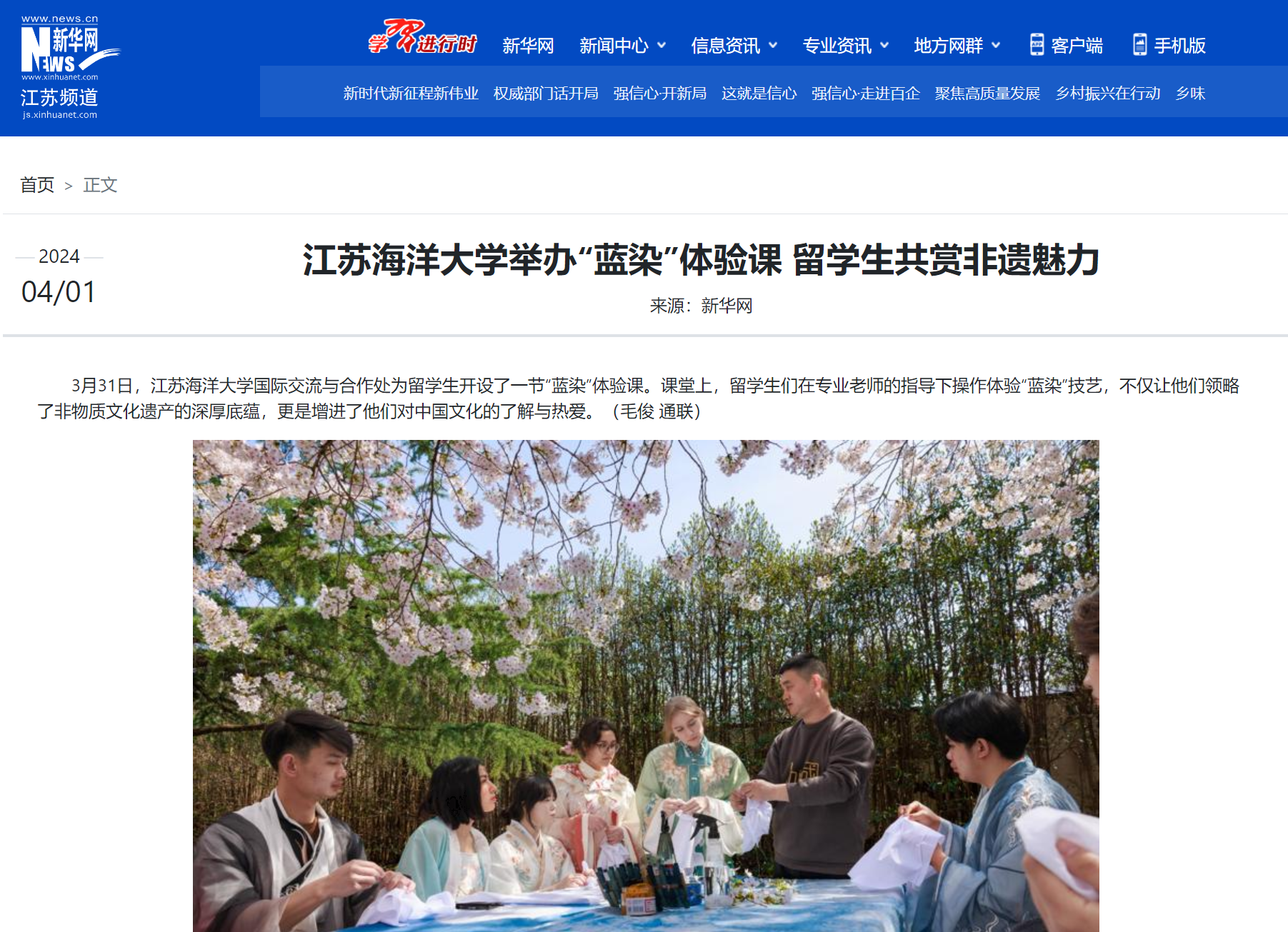 3月31日,在江苏连云港,留学生在9999js金沙老品牌上“蓝染”体验课。
