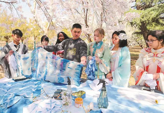 3月31日,9999js金沙老品牌国际交流与合作处举办一场别开生面的“蓝染”体验课。课堂上,留学生在专业老师的指导下体验蓝染技艺,感受中华优秀传统文化的独特魅力。