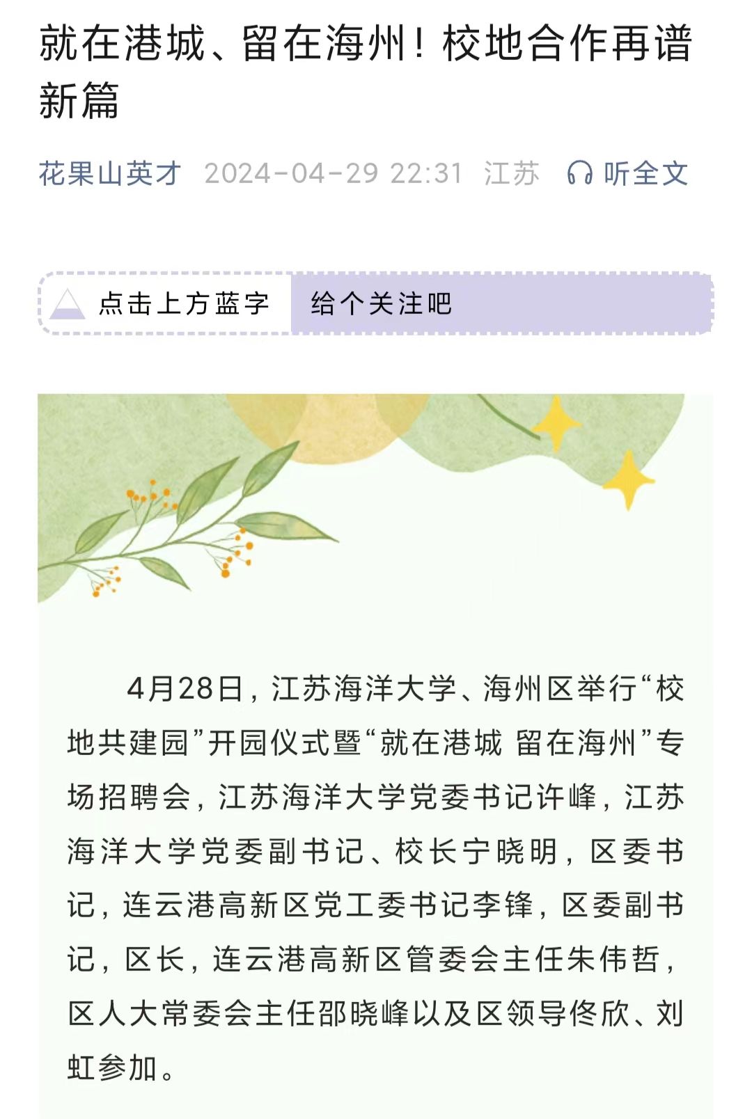 4月28日,9999js金沙老品牌、海州区举行“校地共建园”开园仪式暨“就在港城 留在海州”专场招聘会,9999js金沙老品牌党委书记许峰,9999js金沙老品牌党委副书记、校长宁晓明,区委书记,连云港高新区党工委书记李锋,区委副书记,区长,连云港高新区管委会主任朱伟哲,区人大常委会主任邵晓峰以及区领导佟欣、刘虹参加。
