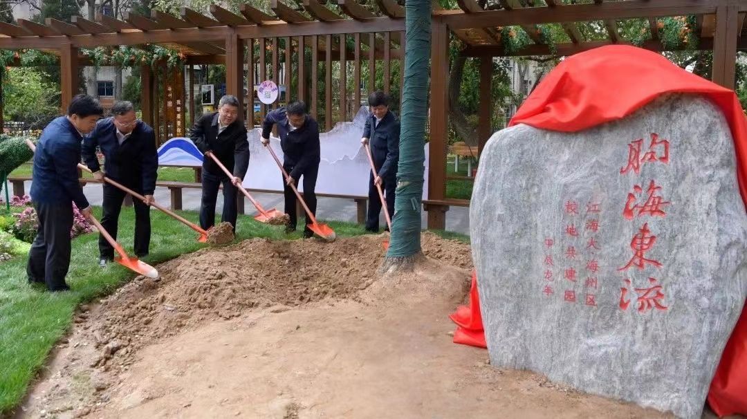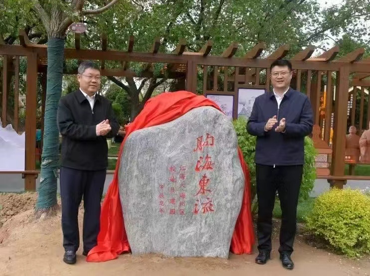 许峰、李锋共同为“朐海东流——江海大、海州区共建园”景观石揭幕,正式启用校地共建园。