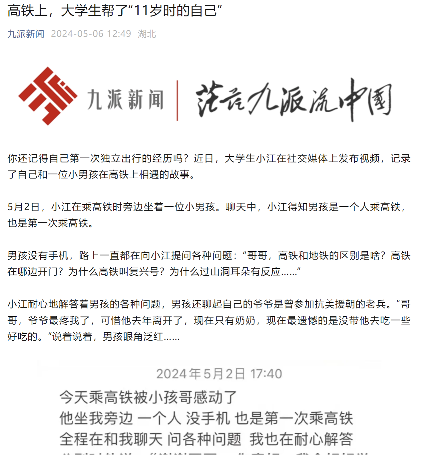 你还记得自己第一次独立出行的经历吗?近日,大学生小江在社交媒体上发布视频,记录了自己和一位小男孩在高铁上相遇的故事。