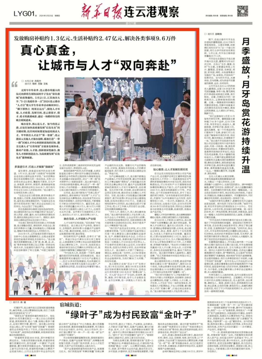 自2022年人才新政2.0颁布后,连云港不断扩大政策覆盖人群、提升资助金额。聚焦人才长期关注、重点关心的住房、子女入学、配偶就业等普遍性问题,近年来,连云港出台居住、就业、教育、医疗4个无忧政策包,为来连人才提供全方位保障。截至目前,已累计发放购房券近1.3亿元,发放人才生活补贴近2.47亿元,为人才解决配偶就业和子女入学等各类事项9.6万件,人才满意度、获得感不断提升。“我去年9月搬到世纪凤凰城小区人才公寓,拎包入住,小区环境好,各种生活设施配套齐全,解决了我的后顾之忧。连云港对待青年人温暖有心,真的很棒。”在江苏联瑞新材料股份有限公司工作的潘玥点赞道。