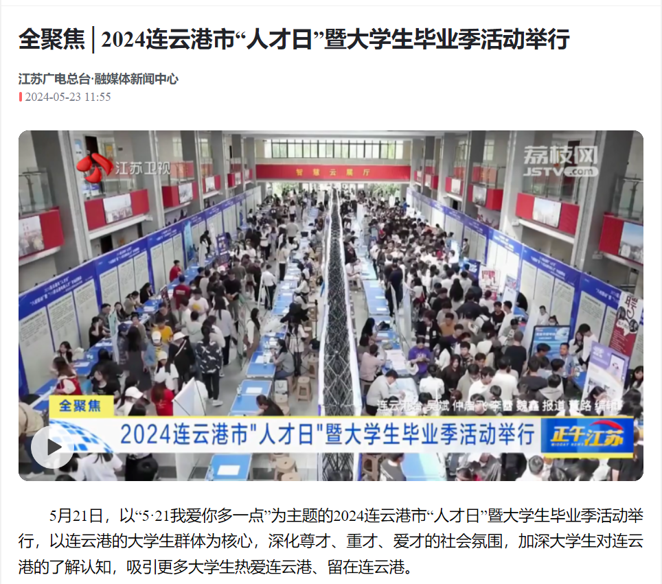 5月21日,以“5·21我爱你多一点”为主题的2024连云港市“人才日”暨大学生毕业季活动举行,以连云港的大学生群体为核心,深化尊才、重才、爱才的社会氛围,加深大学生对连云港的了解认知,吸引更多大学生热爱连云港、留在连云港。