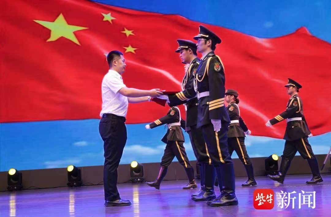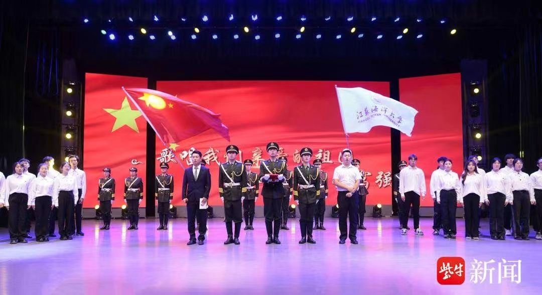 国旗仪仗队接过这面珍贵的国旗,全场师生共同高唱《歌唱祖国》,嘹亮歌声响彻在礼堂。