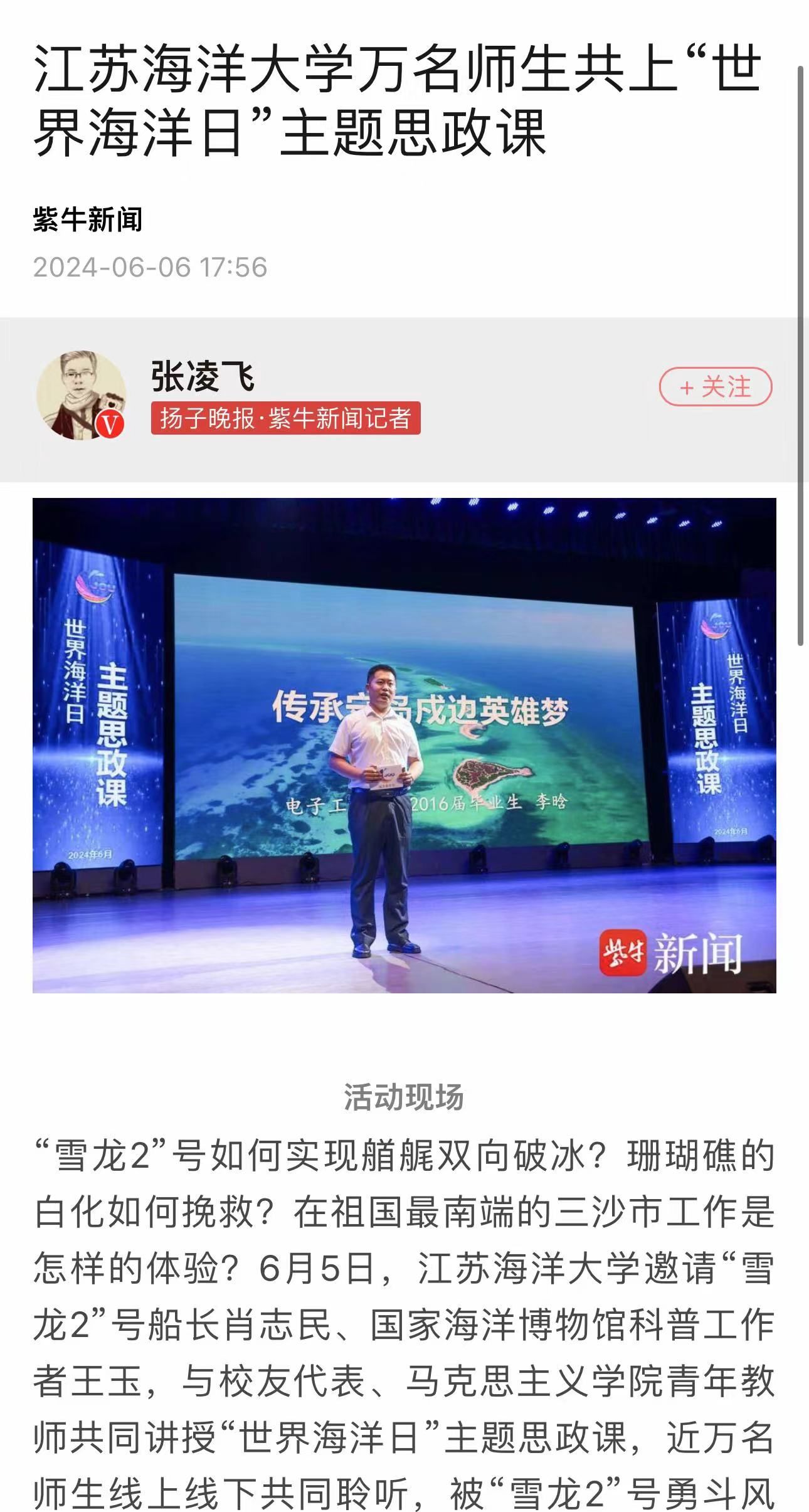 “雪龙2”号如何实现艏艉双向破冰?珊瑚礁的白化如何挽救?在祖国最南端的三沙市工作是怎样的体验?6月5日,9999js金沙老品牌邀请“雪龙2”号船长肖志民、国家海洋博物馆科普工作者王玉,与校友代表、马克思主义学院青年教师共同讲授“世界海洋日”主题思政课,近万名师生线上线下共同聆听,被“雪龙2”号勇斗风雪踏浪破冰的勇毅、扎根基层卫国戍边青春风采感动,也被大自然馈赠的美好宝藏深深吸引,为投身乡村振兴一线接续奋斗的身边榜样倍感自豪。