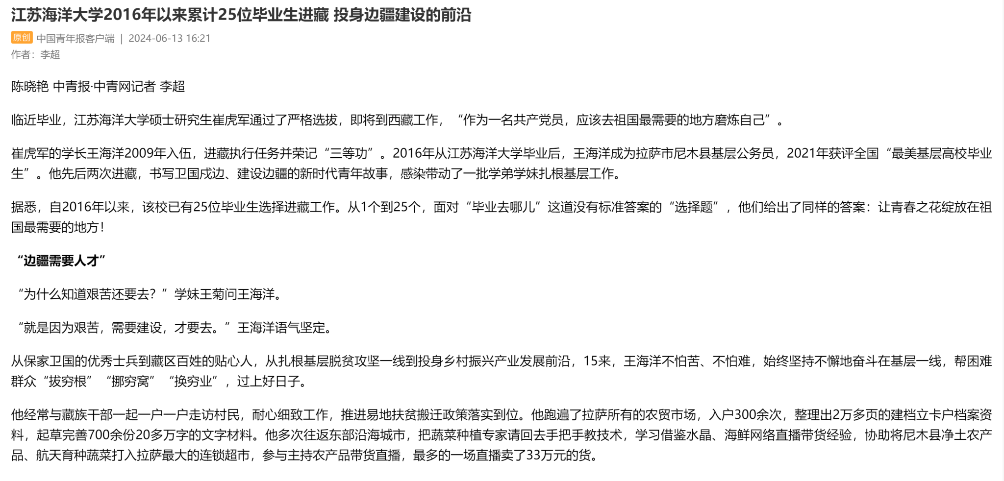 “就是因为艰苦,需要建设,才要去。”王海洋语气坚定。