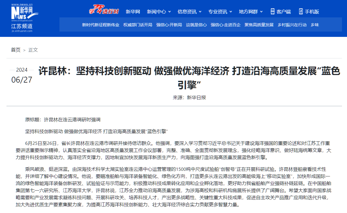 6月25日至26日,省长许昆林在连云港市调研并接待信访群众。他强调,要深入学习贯彻习近平总书记关于建设海洋强国的重要论述和对江苏工作重要讲话重要指示精神,认真落实全省沿海地区高质量发展工作会议部署,完整、准确、全面贯彻新发展理念,强化经略海洋意识、做好陆海统筹文章,大力提升科技创新驱动力、海洋经济支撑力,因地制宜加快发展海洋新质生产力,向海图强打造沿海高质量发展蓝色新引擎。