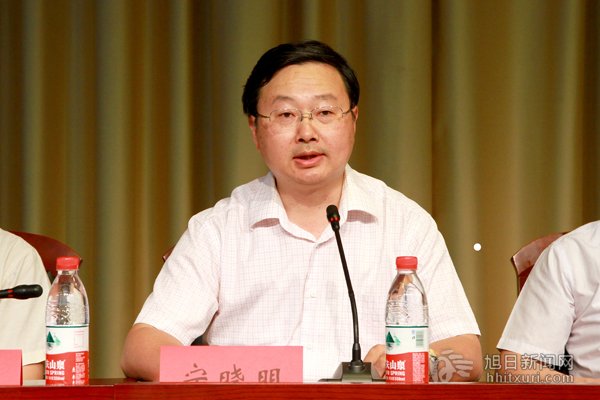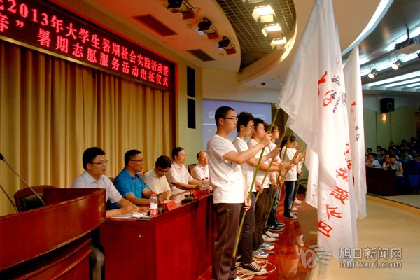 校党委书记陈明辉宣布2013年大学生暑期社会实践活动正式启动。出席仪式的领导为社会实践小分队授旗。