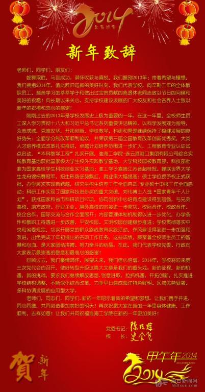 党委书记陈明辉、校长史金飞2014年新年致辞