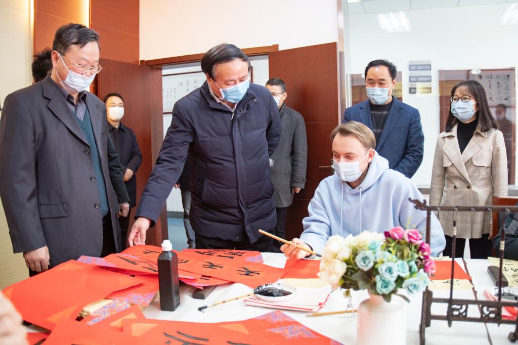 在大学生活动中心,学校为留校学生举办的书法培训活动现场,徐家保一行关切地询问了同学们的留校生活情况,并送上热情的祝福,“给大家拜个早年,祝你们学业进步、幸福美满。”