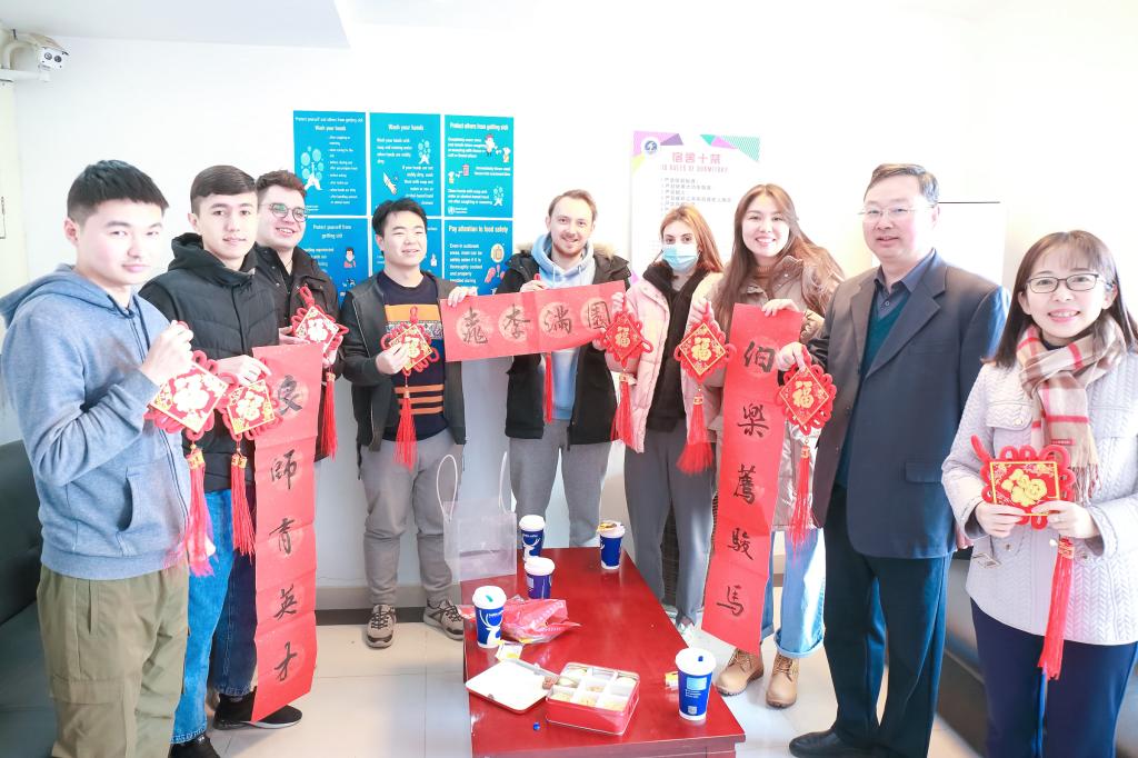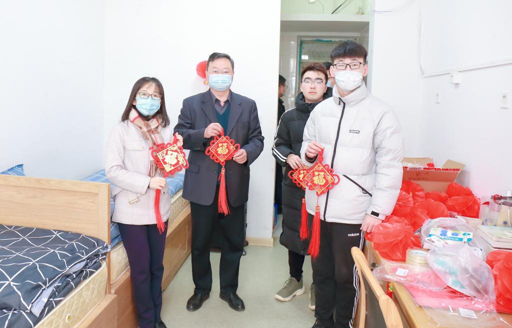 2月4日是农历小年,宁晓明、金芙蓉带着辅导员们来到宿舍,看望寒假留校学生,并送去老师们亲手写的春联,水果、牛奶、坚果等新年礼包,和学生们一起挂上中国结。