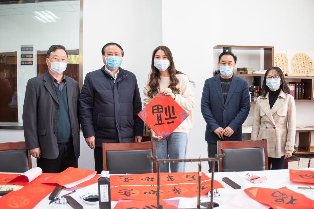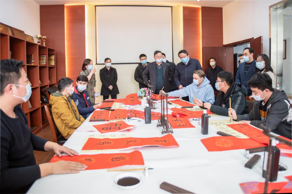看到留学生洛德书写的春联和“福”字,徐家保伸出了大拇指。商学院国际经济与贸易专业留学生,来自吉尔吉斯斯坦的阿克莱已经连续两个寒假没能回家了,今天学习写“福”字,阿克莱开心地对徐家保说“这个福我知道,要倒过来贴,在中国寓意‘福到了’。这真的太有意思了!”