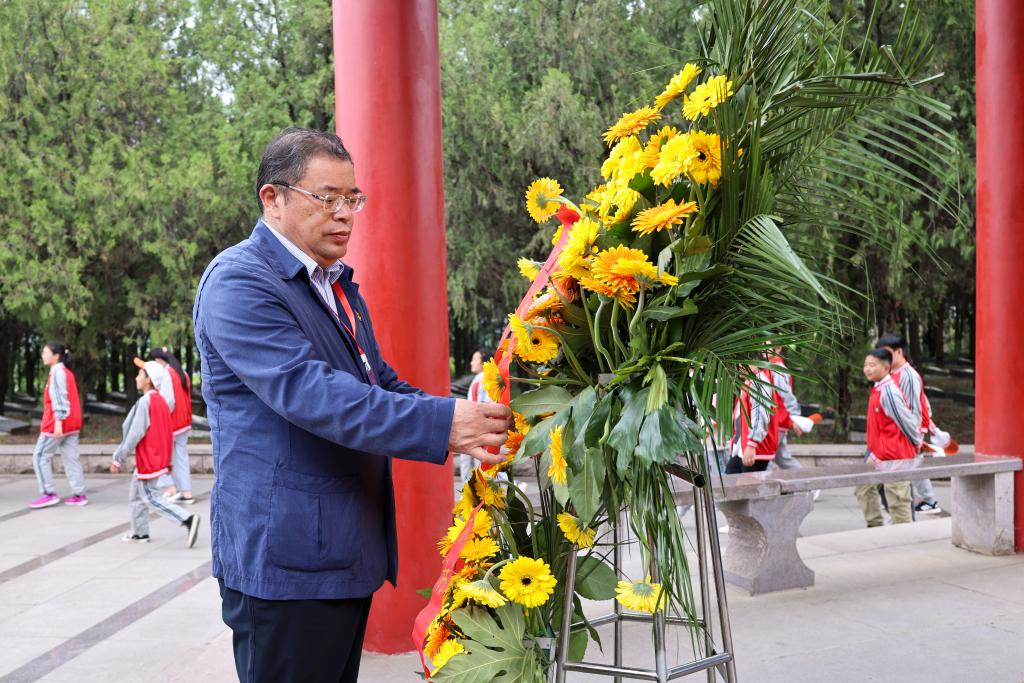 在革命烈士英名碑前,校党委书记王自力代表学校党委向革命烈士敬献花篮,表达对革命烈士的深切缅怀和崇高敬意。全体中心组成员面向英名碑肃立,向在沂蒙大地上英勇牺牲的革命烈士默哀、鞠躬。随后,在校党委副书记史顺良的领誓下,全体成员面向鲜红党旗,高举右手重温入党誓词。