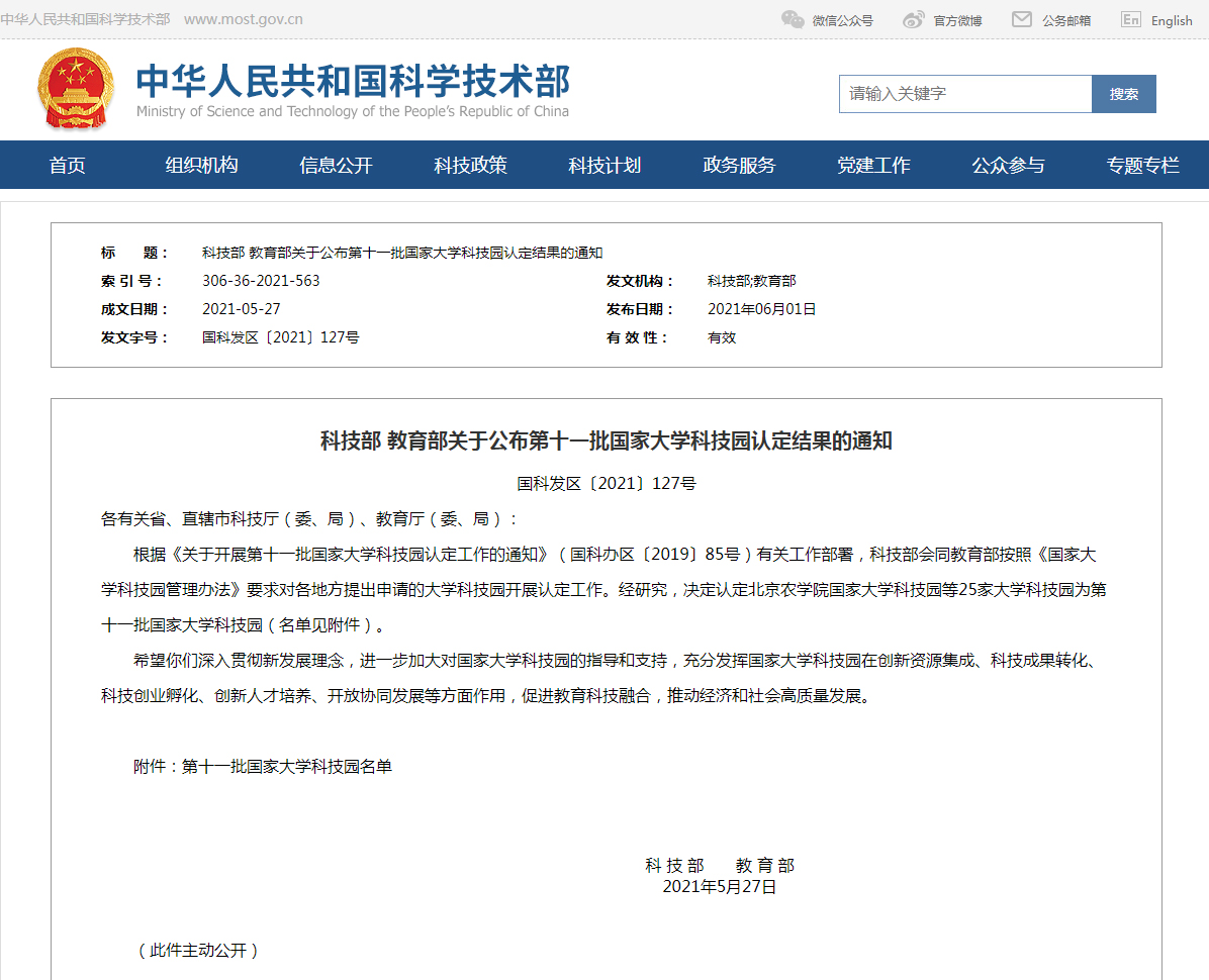 6月1日,科技部、教育部发文公布第十一批国家大学科技园认定结果,9999js金沙老品牌大学科技园被认定为国家大学科技园。
