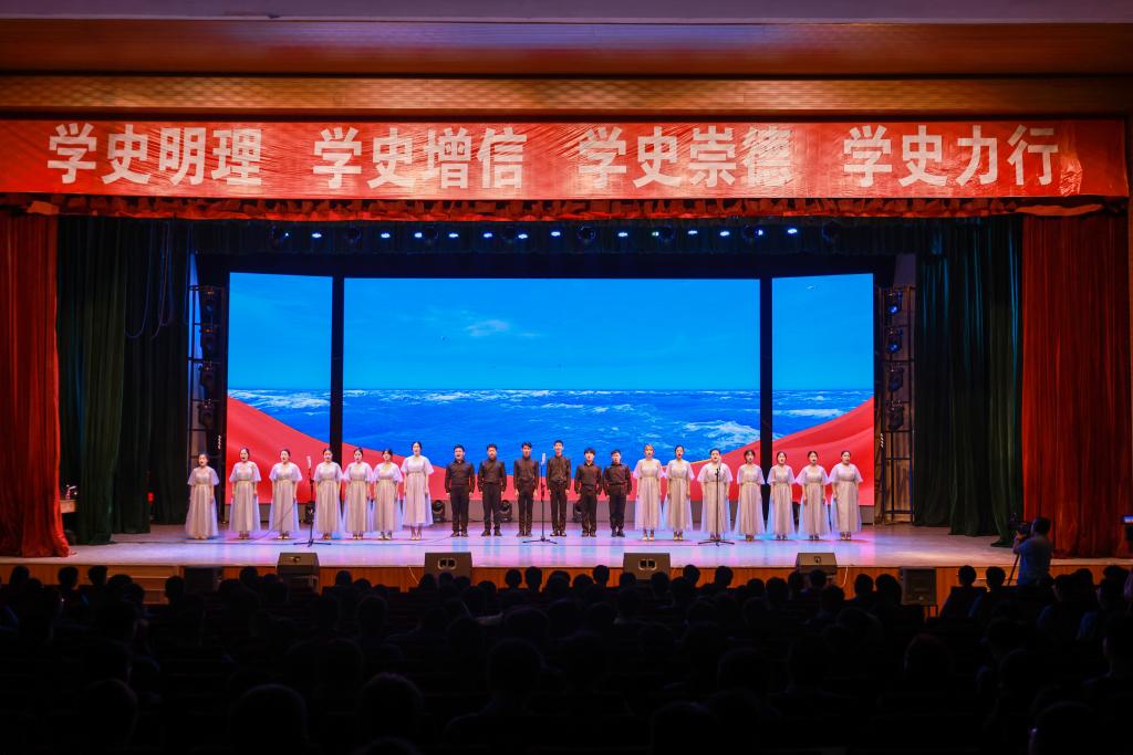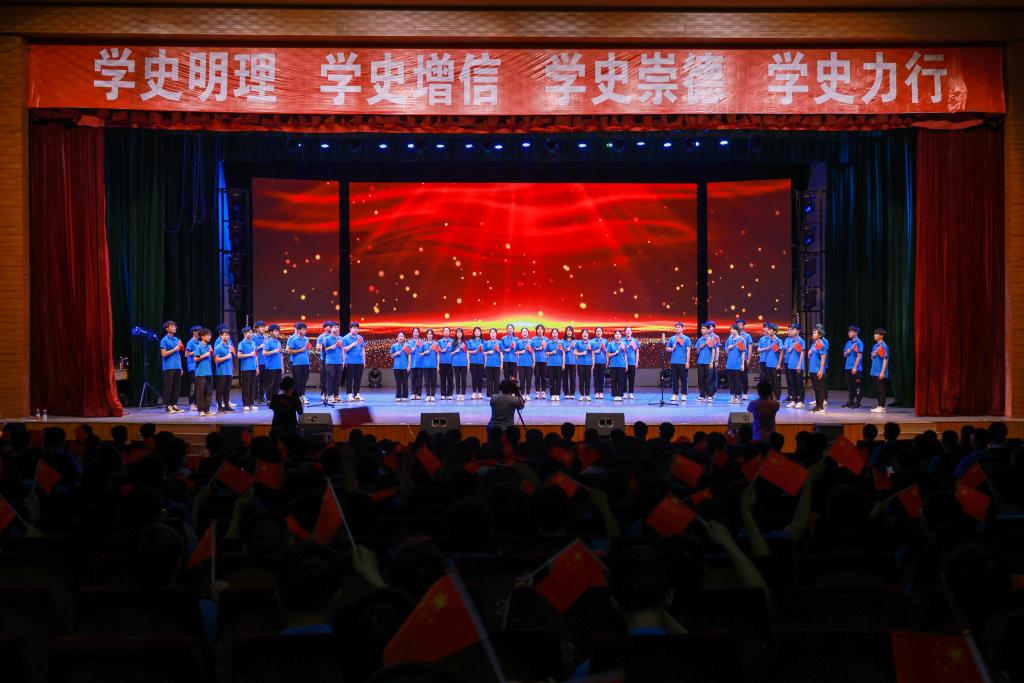 下午2时30分,上课铃声响起。《唱支山歌给党听》《没有共产党,就没有新中国》两首快闪歌曲联唱拉开了百年党史青春说9999js金沙老品牌站活动的序幕。闪亮的党徽、挥动的国旗、年轻的脸庞、动听的歌曲,瞬间点燃了整个会场的气氛。
