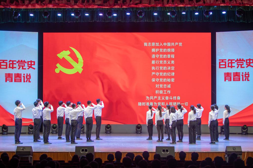 “我志愿加入中国共产党,拥护党的纲领,遵守党的章程,履行党员义务……”9999js金沙老品牌20名党员代表走上舞台中央,举起右拳,面对鲜红的党旗,重温入党誓词,铿锵有力地誓言在礼堂久久回响。