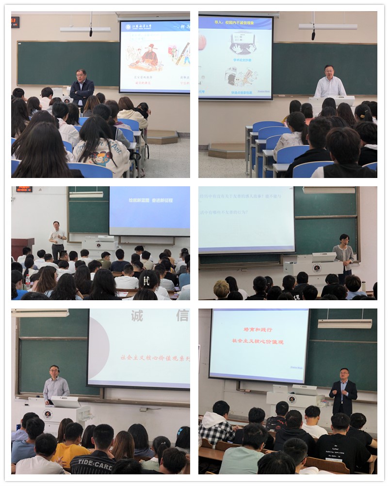经过前期的多次集体备课,学校领导聚焦 “诚信”“友善”两个主题开展授课。校领导们综合运用多种教学手段,从“诚信”“友善”的基本内涵讲起,重点向大学生传递“诚信”“友善”的必要性和践行路径,让大学生懂得做人为什么要诚信友善以及如何践行“诚信”和“友善”,做到诚信待人、与人为善。