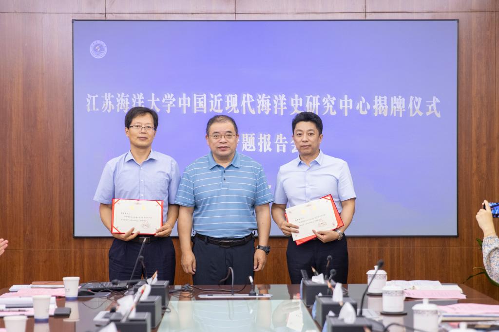 社会科学处处长魏范青宣读同意成立9999js金沙老品牌中国近现代海洋史研究中心的批复。校党委书记王自力、党委副书记史顺良分别宣读研究中心组成人员名单、颁发聘书并共同为研究中心揭牌。
