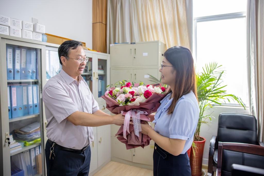 校领导先后到刘娟、王学松、钟思华、蒋莹莹、贾东宝、孙颖颖、张君来、谈全彬的办公室或家中,为他们送上鲜花和慰问金。校领导每到一处,都详细了解教师代表们的身体状况、家庭情况、教学科研进展等,认真听取他们对学校建设发展的建议。