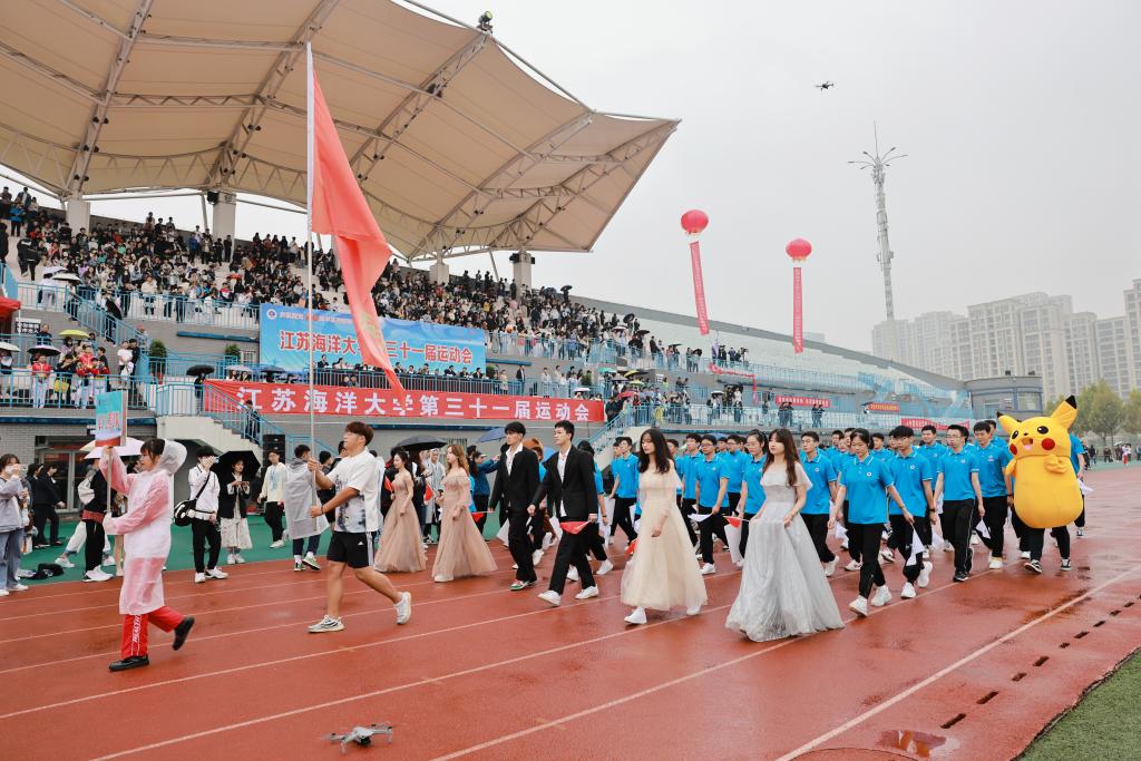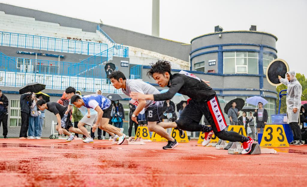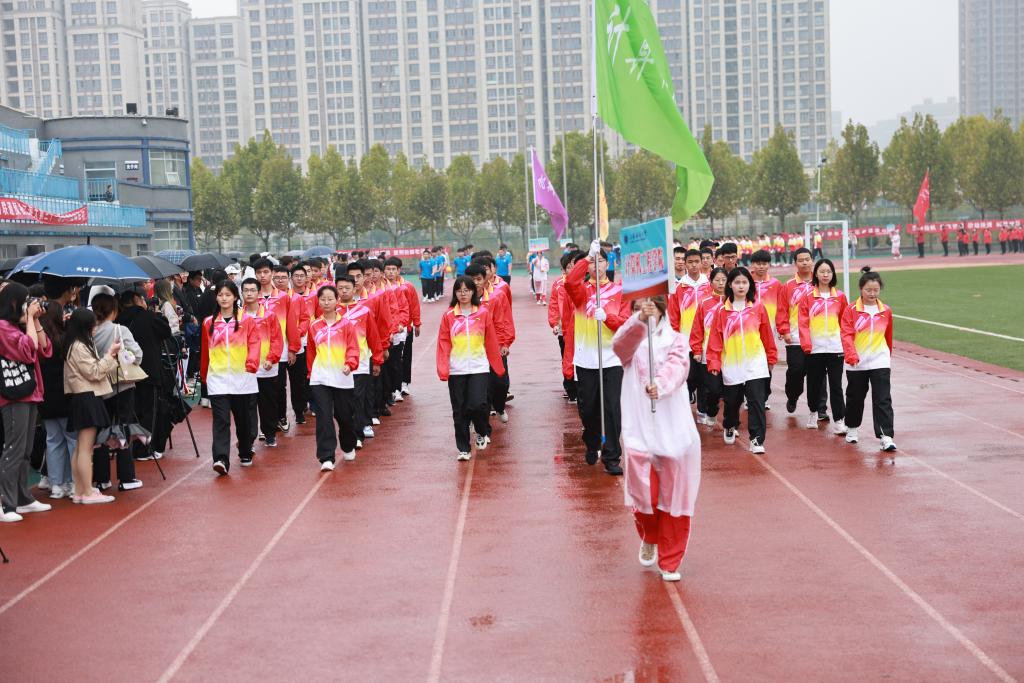 田径操场上,运动员们奋勇拼搏,敢于争先,趣味运动项目中,运动员们团结协作,互帮互助。数十位裁判员和工作人员不畏寒风细雨,身披雨衣,助力运动会比赛井然有序地开展。