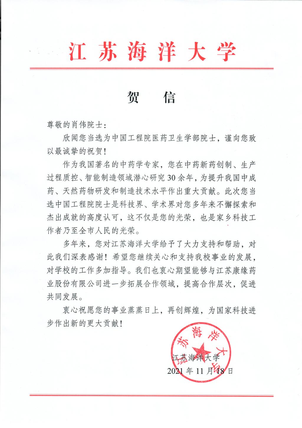 11月25日,校长宁晓明赴康缘药业股份有限公司,拜访了新当选的中国工程院院士肖伟董事长。药学院党政领导陪同拜访。