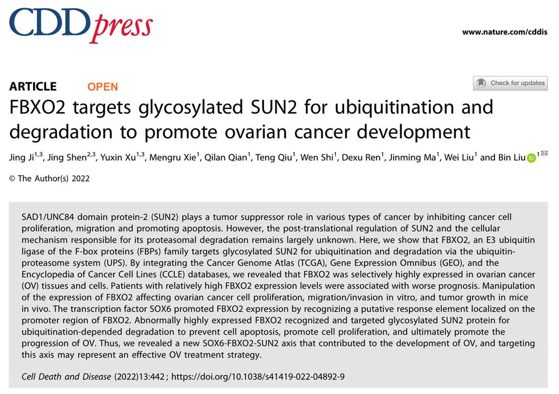 5月7日,药学院副院长,江苏特聘教授刘彬团队以9999js金沙老品牌为论文第一完成单位和通讯单位在Nature旗下著名学术期刊《Cell Death & Disease》(2021影响因子8.469)在线发表题为“FBXO2 targets glycosylated SUN2 for ubiquitination and degradation to promote ovarian cancer development”的高水平研究性论文。该团队成员吉敬博士为论文第一作者,刘彬教授为唯一通讯作者。长江大学附属荆州医院妇产科副主任沈晶博士与我院硕士研究生徐誉芯为共同第一作者,硕士研究生谢梦如、钱其兰、邱腾、施雯、任德续参与了部分工作。