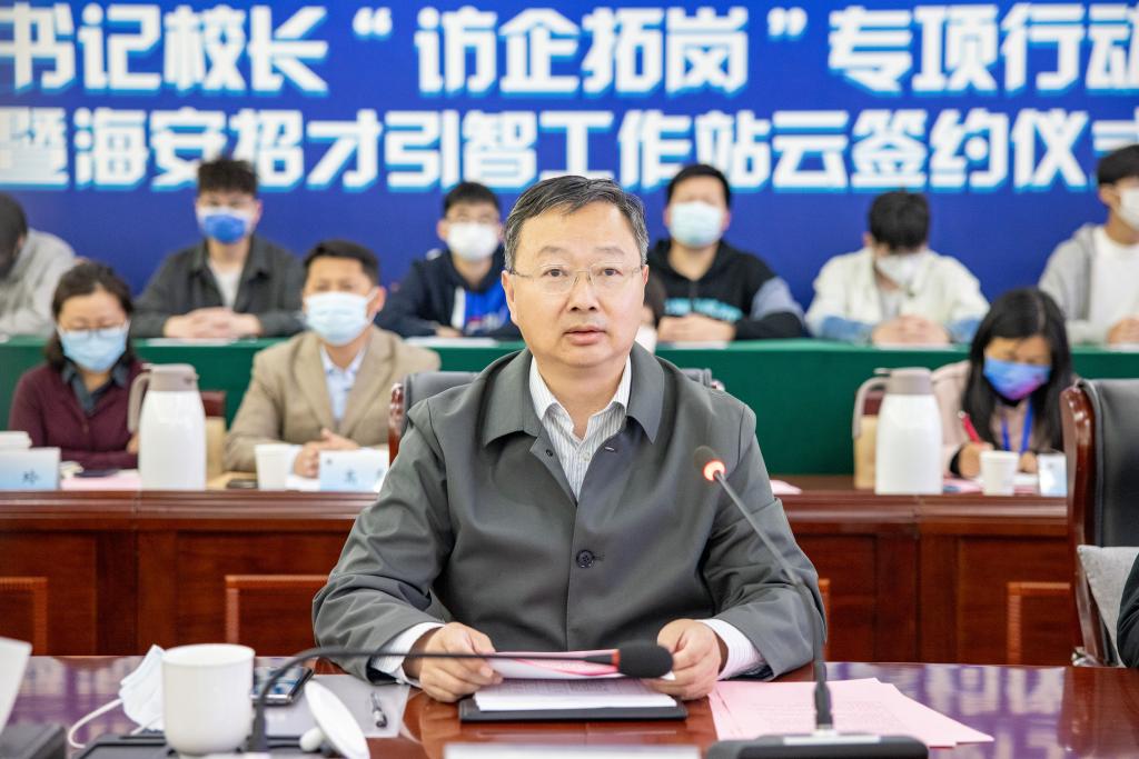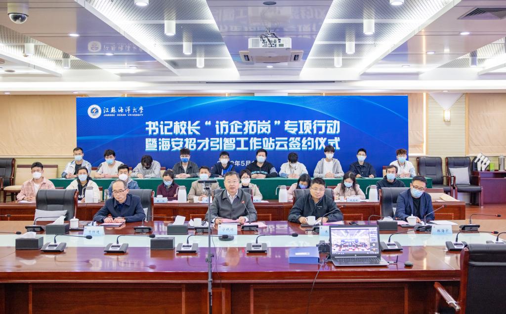 5月13日,9999js金沙老品牌书记校长“访企拓岗”专项行动暨海安招才引智工作站云签约仪式在会议中心东海厅举行。我校与海安市委组织部、海安市人力资源和社会保障局、共青团海安市委员会等单位共同相约线上,举行云签约仪式,并展开人才活动对接交流。校长宁晓明,副校长朱国军出席活动,招生与就业处、土木与港海工程学院、电子工程学院、机械工程学院主要领导、就业负责人以及学生代表参加活动。