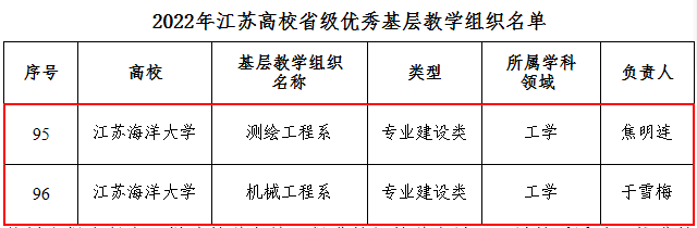 近日,省教育厅下发《关于公布2022年江苏高校省级优秀基层教学组织名单的通知》(苏教高函〔2022〕12号),公布了2022年江苏高校省级优秀基层教学组织名单,此次共认定100个高校省级优秀基层教学组织。我校推荐的测绘工程系、机械工程系2个基层教学组织成功入选。