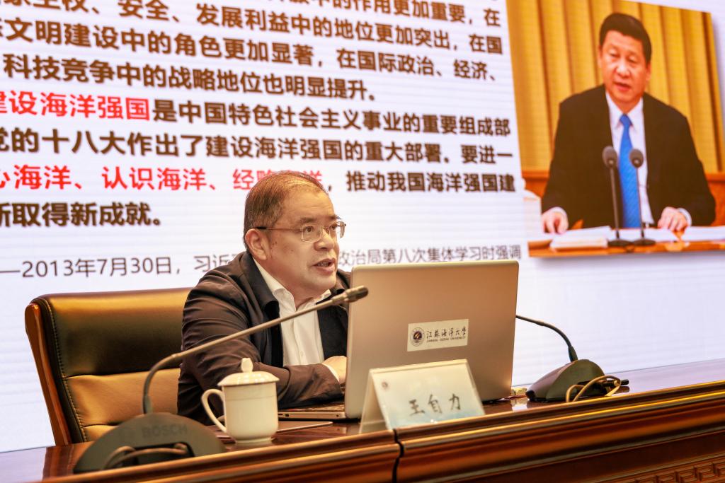 王自力通过大量的历史事实及详实的数据资料,阐释了古代中国海洋的经验与教训、近代中国海洋的屈辱与抗争的史实,从海洋经济、海洋军事及海洋科技三方面展现了现代中国海洋的崛起与腾飞。本次授课内容主题鲜明,内涵丰富,信息量大,具有很强的思想性、时代性和指导性,让同学们对海洋强国战略有了更深刻的理解。