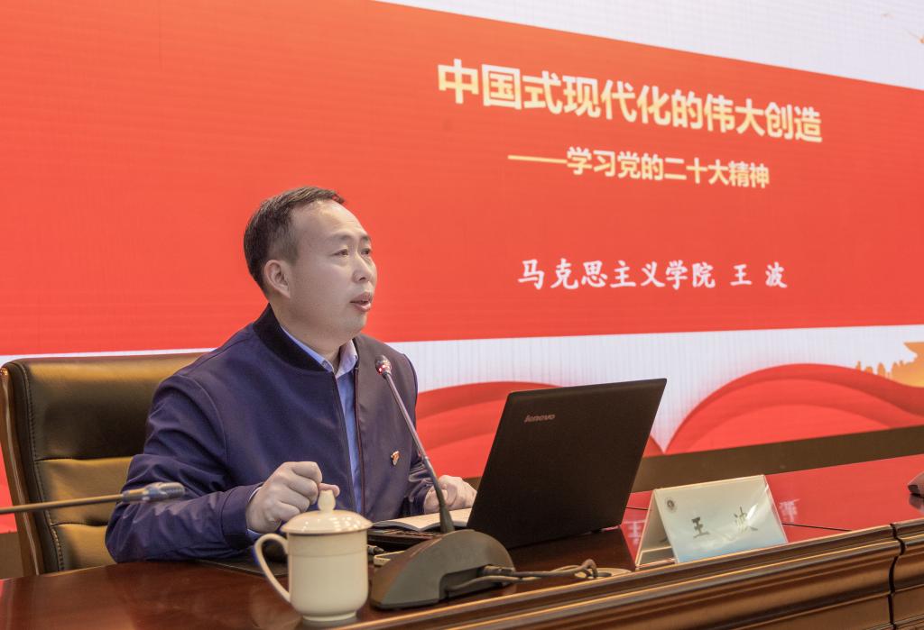 会议邀请马克思主义学院党总支书记王波作“中国式现代化理论的伟大创造”专题辅导报告。王波重点围绕中国式现代化何以可能、何以形成、何以特殊、何以拓展四个方面,从理论维度、历史维度、现实维度、未来维度、实践维度对中国式现代化的核心内容、本质特征、战略安排和重要意义等进行了生动解读和系统阐释。
