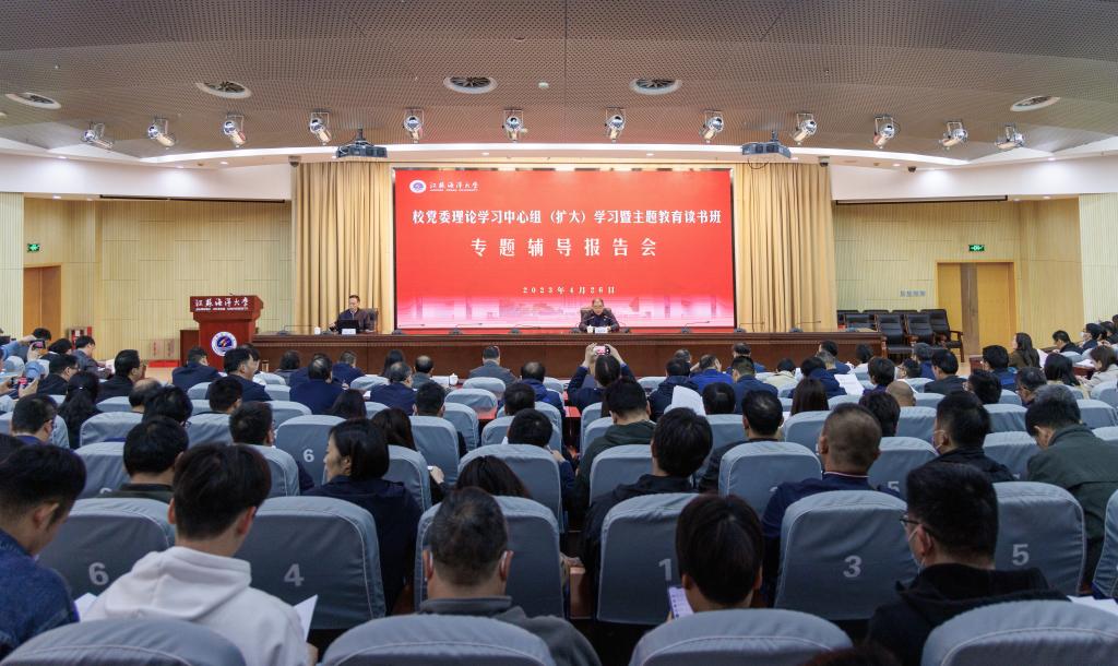 为深入推动学习贯彻习近平新时代中国特色社会主义思想主题教育走深走实,4月26日下午,学校在会议中心黄海厅召开党委理论学习中心组学习(扩大)会议暨主题教育专题辅导报告会。校党委书记王自力主持会议并讲话。全省第一批学习贯彻习近平新时代中国特色社会主义思想主题教育第二十五巡回指导组成员解发瑜和刘牧同志到会指导。在连校领导、“两委委员”、全体中层干部、党支部书记300余人参加会议。